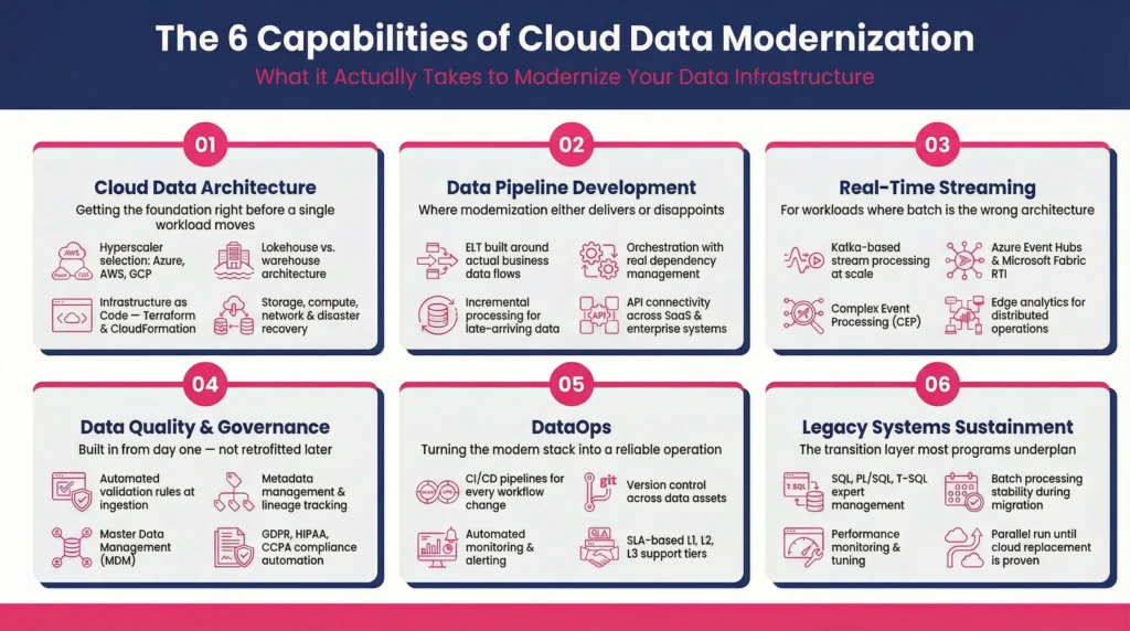 Data modernization in cloud environments goes further still, it means re-architecting around cloud-native capabilities: elastic compute, managed services, automated governance, and real-time processing that on-premise infrastructure simply can’t replicate. Conflating these three things is where most programs go sideways before they even start.