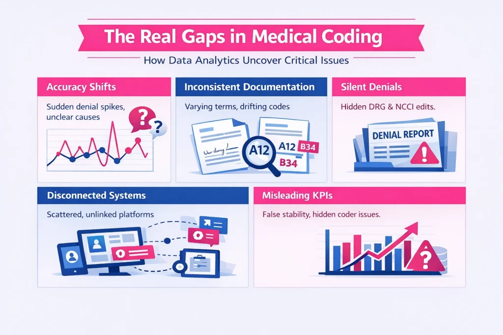 By the time the monthly summary surfaces any of this, the financial damage has already compounded. That’s the core problem data analytics in medical coding is built to solve.