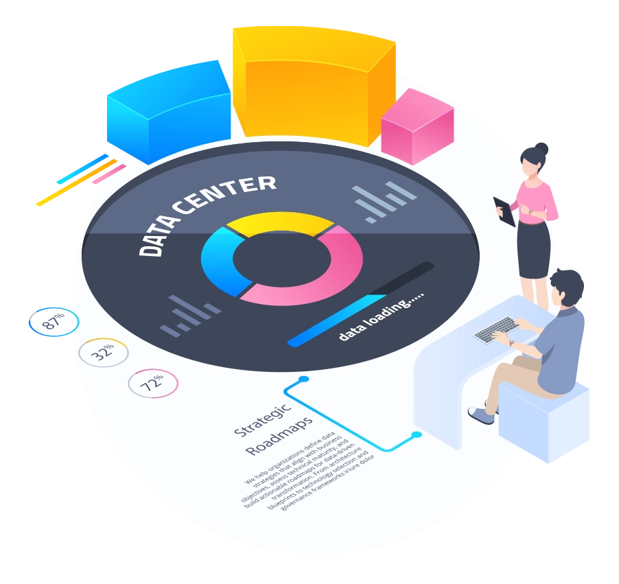 We partner with customers to define comprehensive data strategies aligned with business objectives. Our approach includes current state assessment, gap analysis, prioritization frameworks, and multiyear roadmaps that guide investments in data platforms, analytics, AI, and governance, ensuring strategic alignment and measurable ROI.
